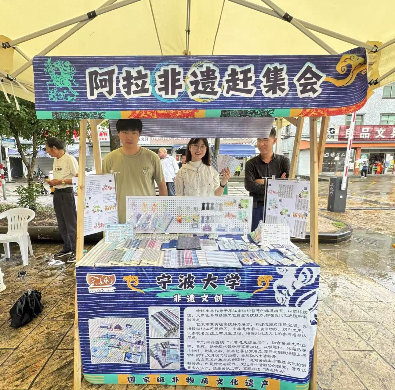 “阿拉非遗集市”的宁波大学文创摊位前,陈列着由学院学子精心创作的非遗文创产品,这些产品将传统纹样解构重组,从钥匙扣、冰箱贴等小物件,到笔记本、帆布包等日常用品,每件文创既保留了土布的古朴韵味,又具现代时尚感,自然融入生活场景。在此刻,学生的设计的已不是产品,而是文化传承的路径。