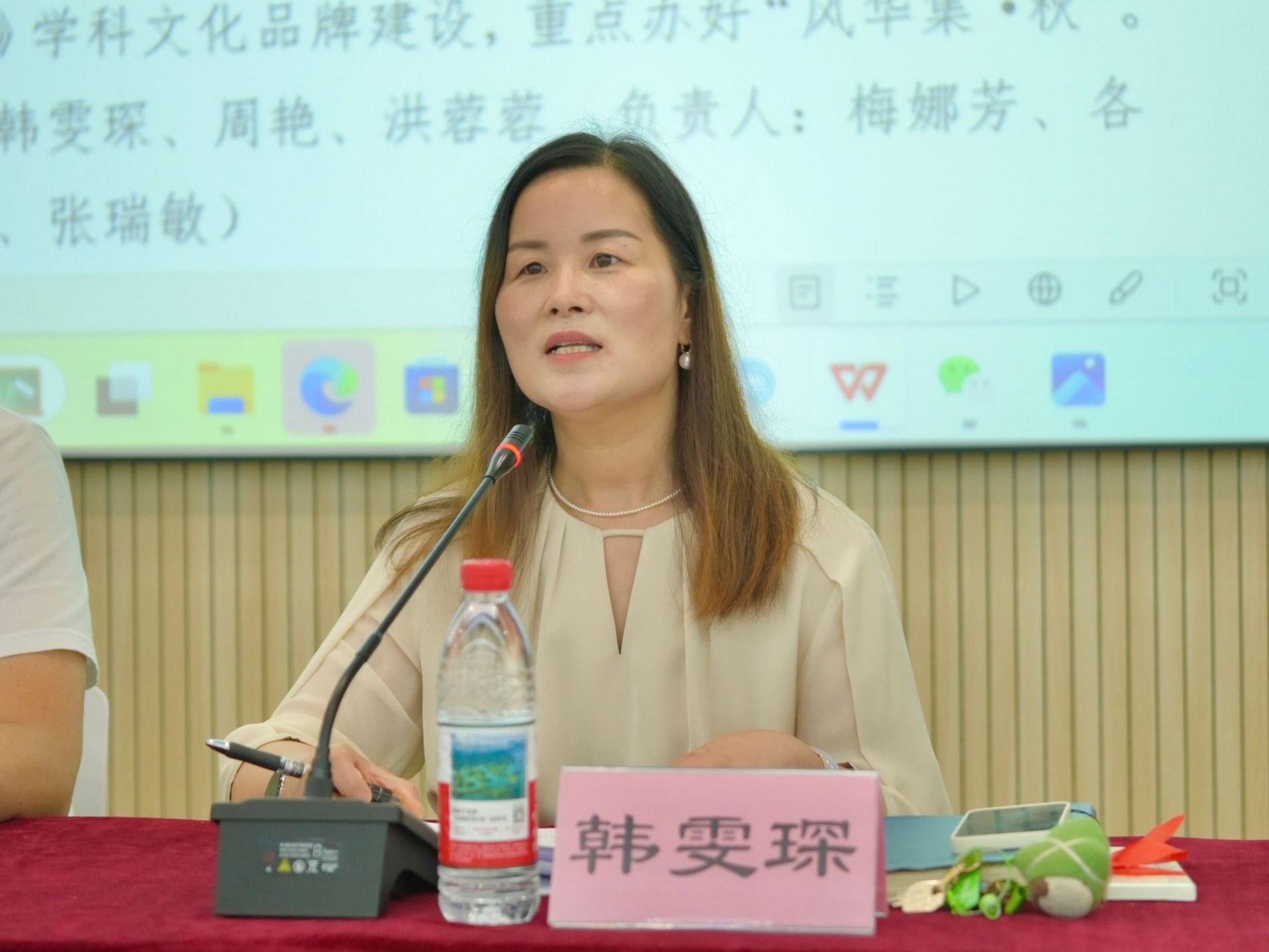 会议第五阶段,由学院党委书记韩雯琛为全体教职工上了“开学师德第一课”。她表示第一要认清形势,迎接挑战,凝心聚力把学院建好建强,她从6个方面分析了当前学院专业发展的困境与挑战。希望各系主任、副系主任发挥好带头作用,带领老师们以“主人翁”姿态和担当,在“十五五”规划制定等重大工作上齐众心、集众智、汇众力。第二要守住底线,追求高线,做好教书育人大先生。她希望老师们要不忘作为教育工作者的初心,牢记“立德树人”根本任务,增强教师职业认同感,严格遵守《新时代高校教师职业行为十项准则》,努力成为为国育才“大先生”。