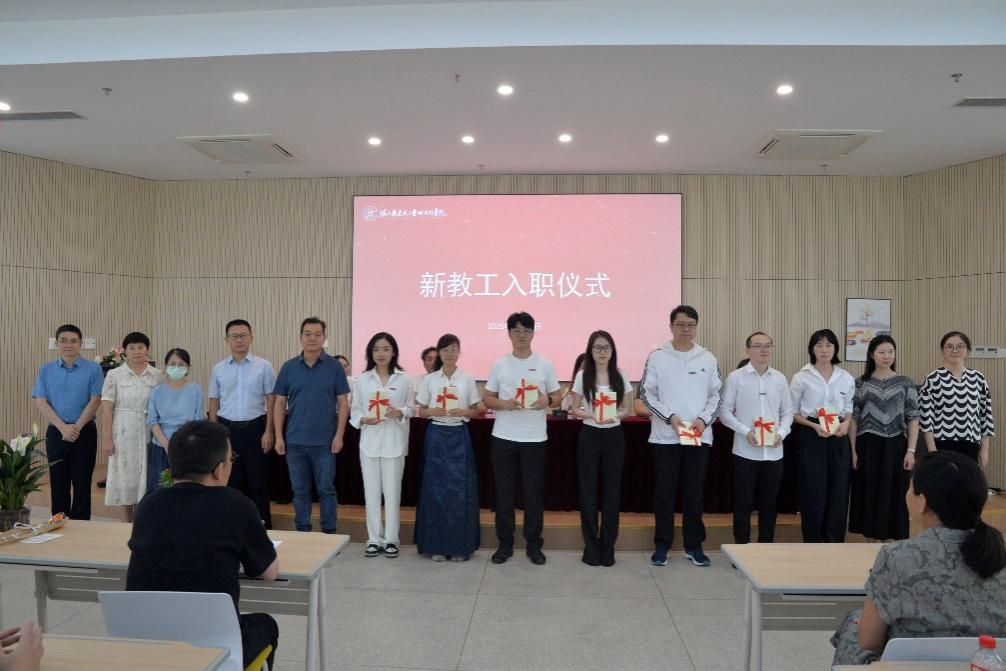 会议第二阶段,举行了新教工入职仪式。教授代表和各系(办)主任为新教工佩戴宁波大学校徽并赠书,热烈欢迎他们正式成为潘艺大家庭的一员。
