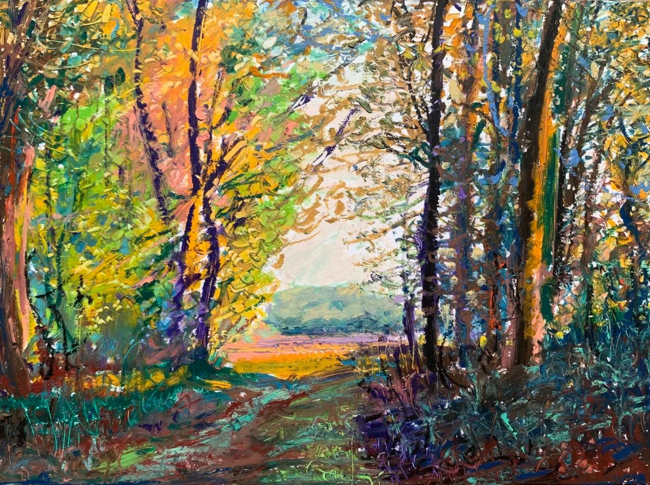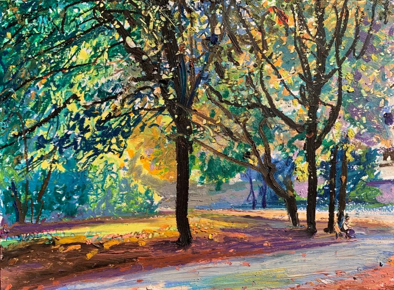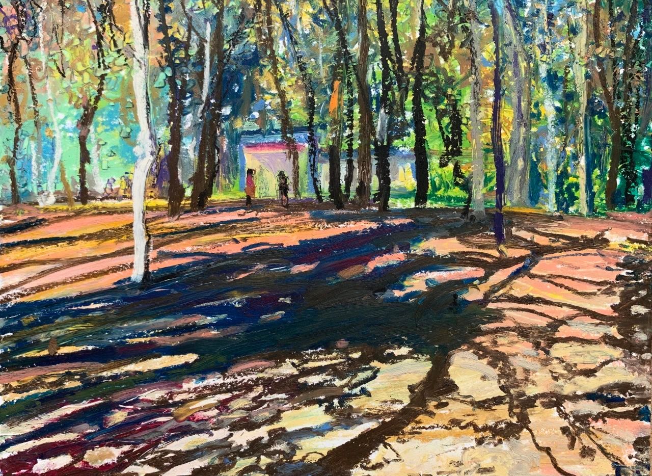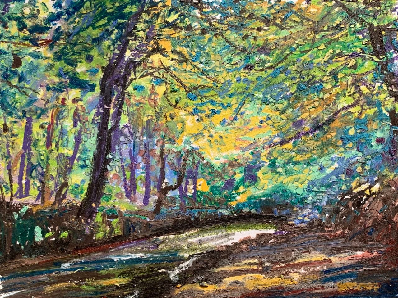 写生让我认识到人类与自然的关系自有一种和谐,人和人的和谐,人和大自然的和谐应当成为一种共存的本质。然而,最终大自然以一种超越人类的方式存在,其所隐含的一切美是人类无法用艺术彻底表现出来的。这是我通过写生深切体会到的一点。尽管如此,我还是愿意让写生成为一种审美生活的方式,让写生成为对我所看到所感受的一切的视觉记录。我时常走到住所附近的树林里去,林间保持自然的原始状态,但是其间有散步小道贯穿,有时围绕着湍急的河流辗转深入,引我一时间走的很远。人们闲暇的时候喜欢在林间散步,呼吸着清新的空气,自在放松。河边的略微开阔的沙滩上也有亲朋或家人或铺布野餐,或沐浴阳光,孩子在河边戏水玩耍。我则寻找着角度,悄悄坐下来描绘眼前的景色,耳边是河流喧哗的声响。阳光照进林间,形成斑驳的光影,幽林树叶的点状明暗色光,与河流声共同构成此时声色光的自然之美。便有了一种闪烁跳跃的音乐质感,仿佛一曲节奏欢快的圆舞曲,让我的眼光也波荡流动起来。
