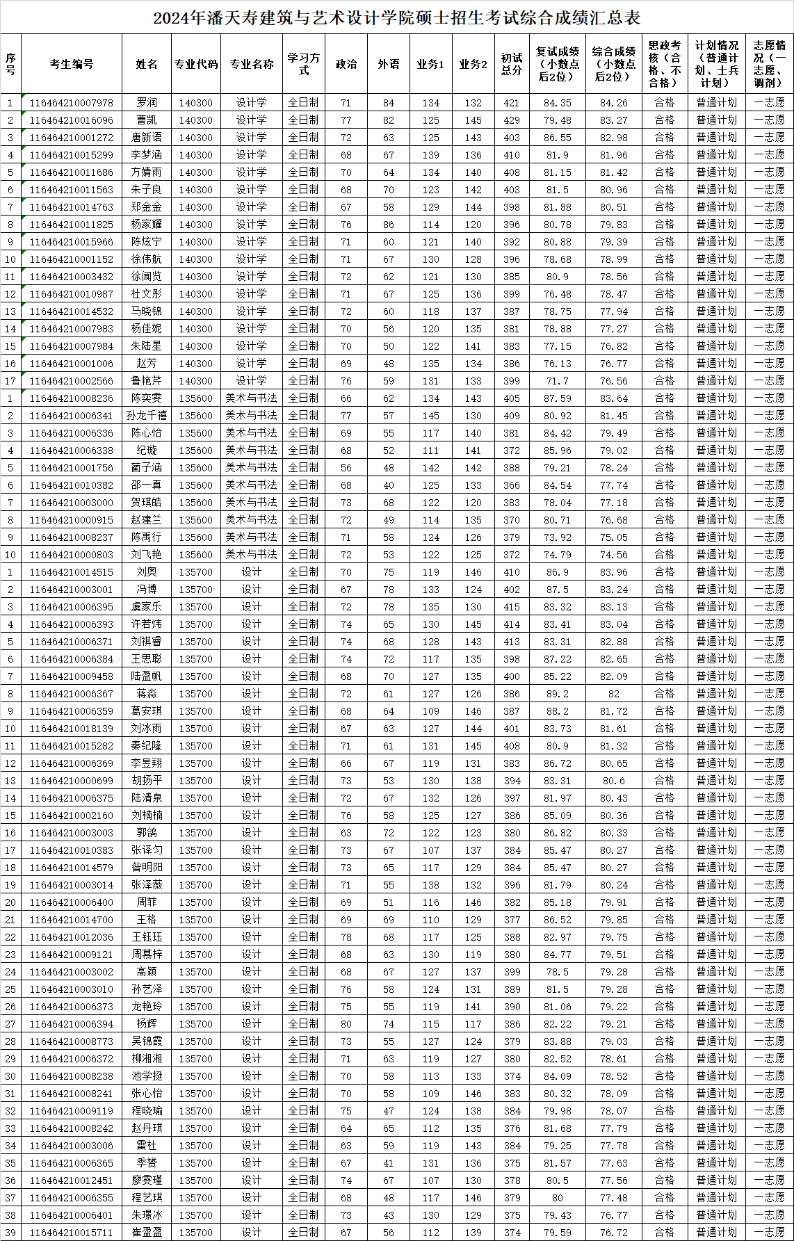 2024年潘天寿建筑与艺术设计学院硕士招生考试综合成绩公示