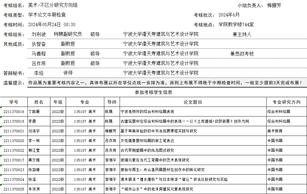参加中期检查布展作品至少须提前三天完成布展,具体布展听从学位点统一安排。要求:专硕每人作品不少于2幅,按两个版面排版展出;学硕每人作品不少于1幅,按一个版面排版展出,展出版面尺寸规格为1200mmx900mm,版本具体排版格式要求由各专业自定,要求明确:学生姓名 学号 专业 研究方向 和导师。