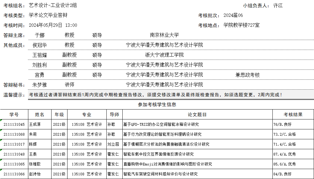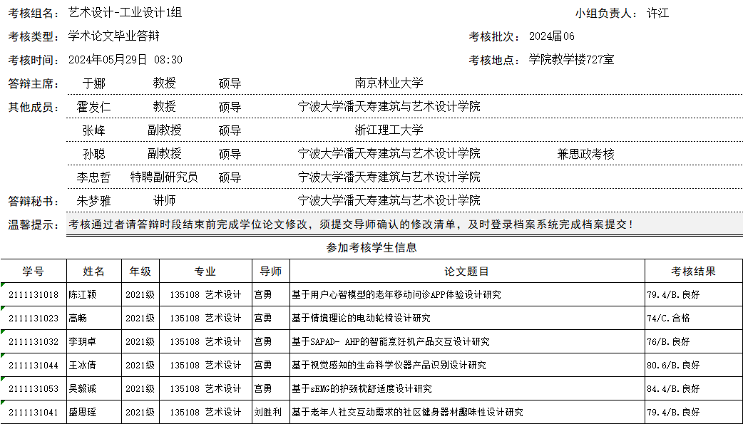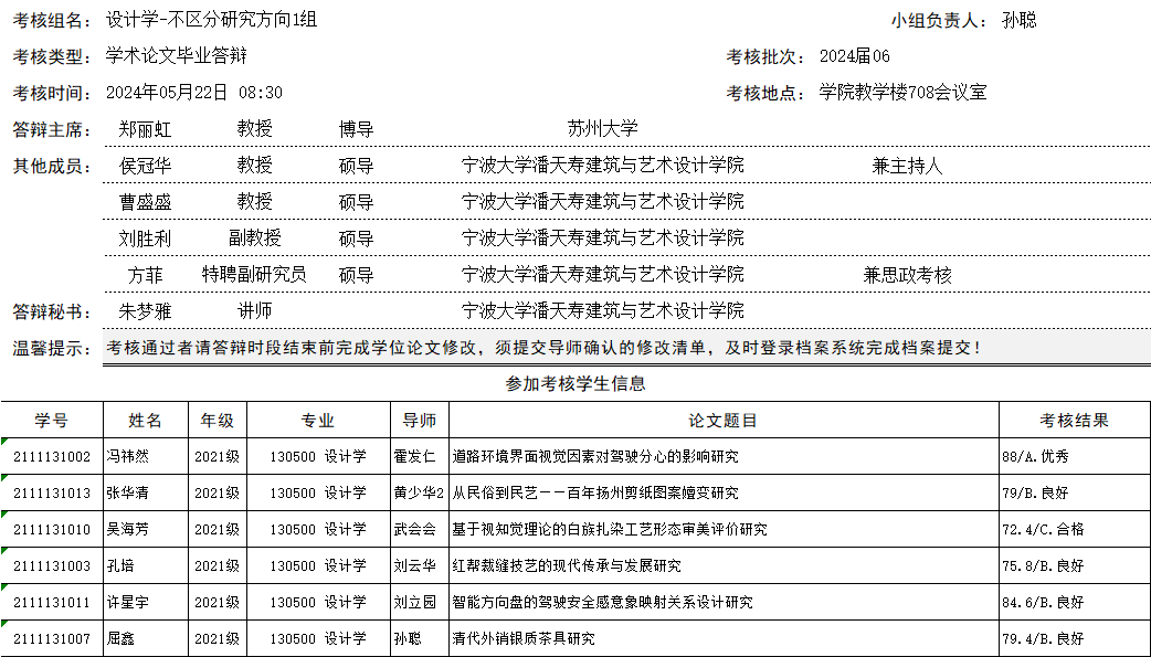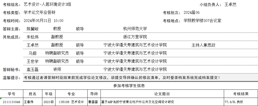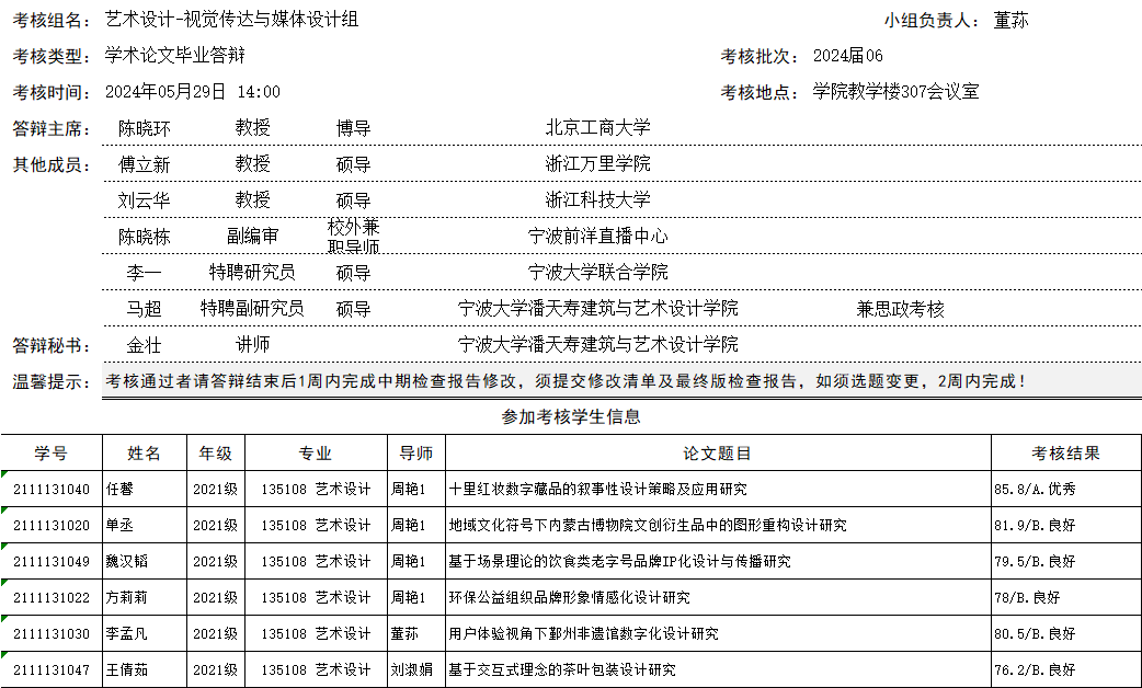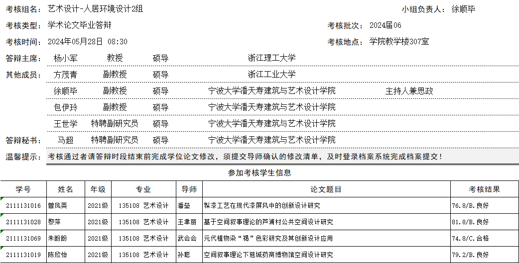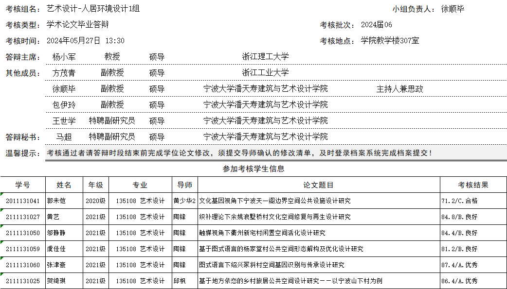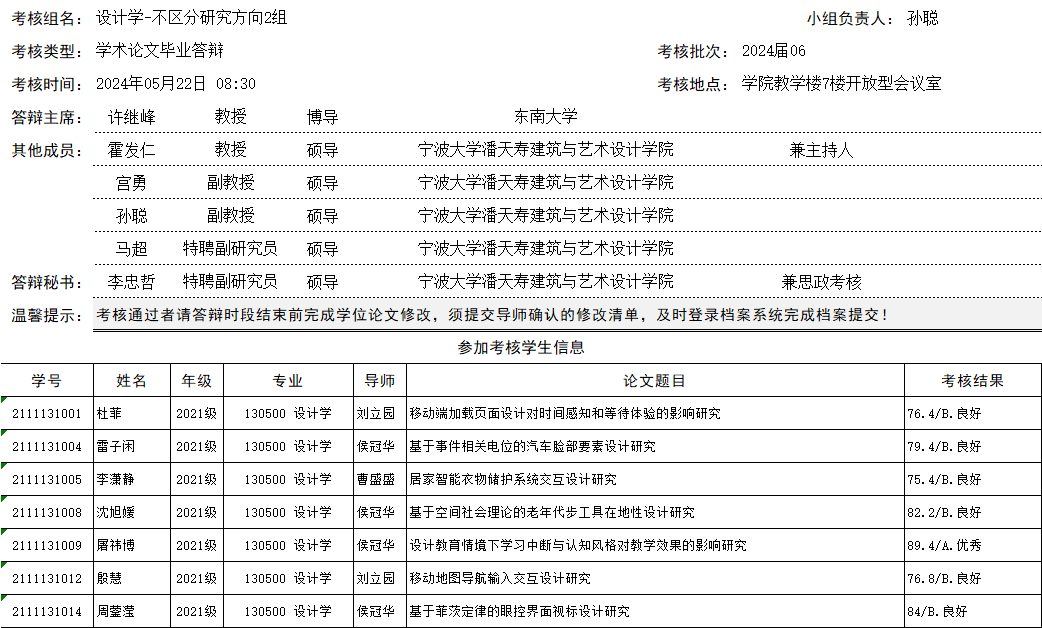 宁波大学2024届06批次潘天寿建筑与艺术设计学院硕士学位论文毕业答辩结果公示