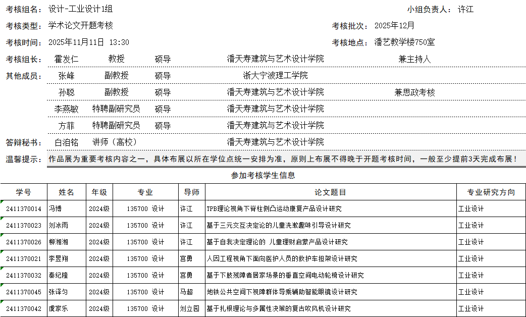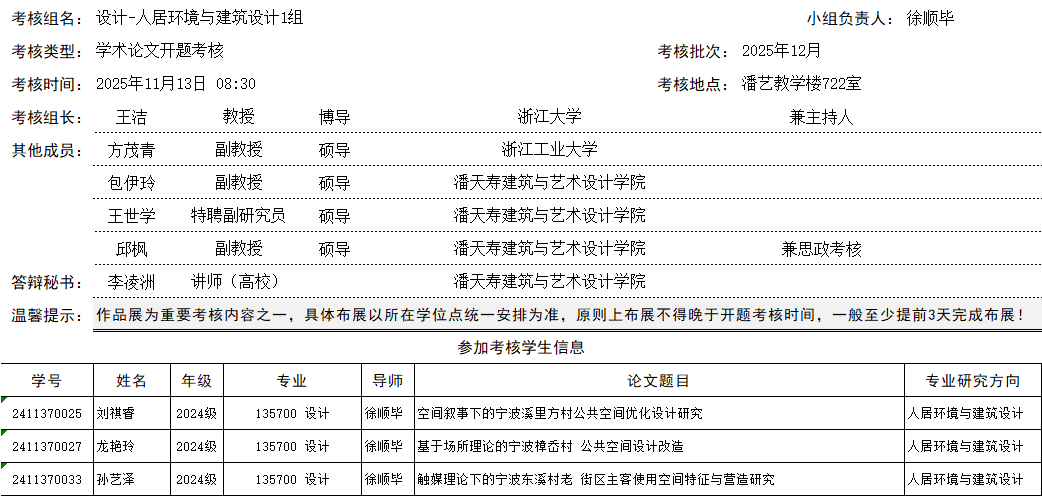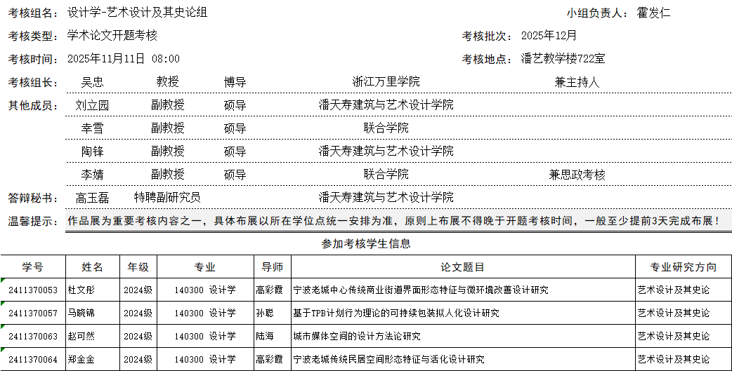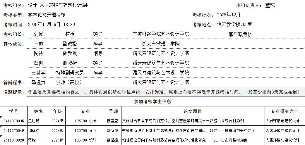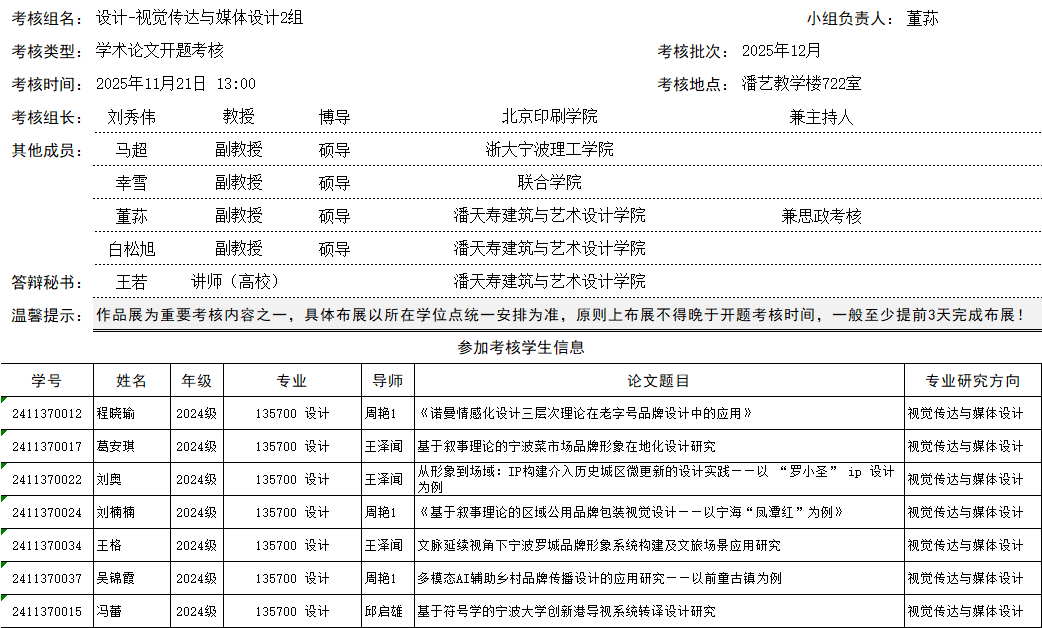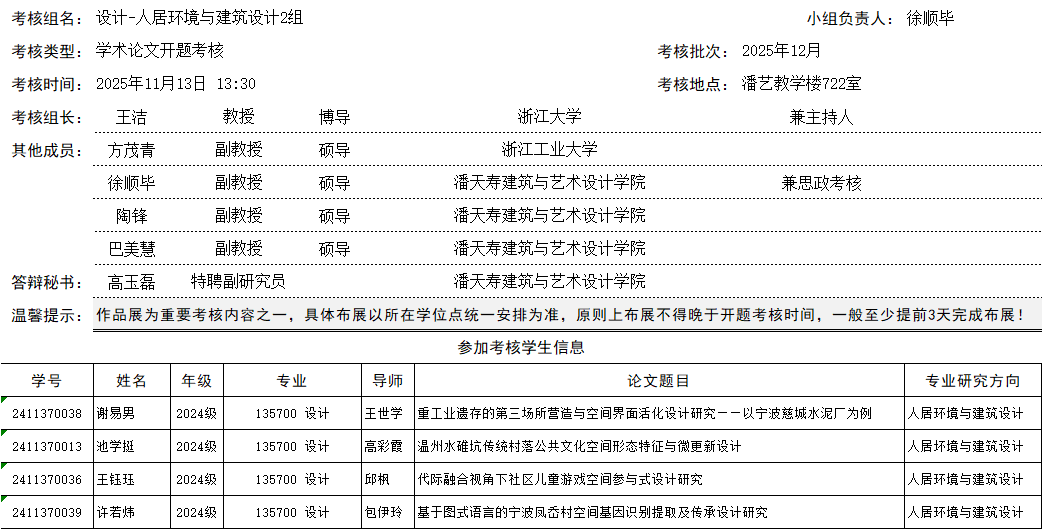 宁波大学潘天寿建筑与艺术设计学院2025年度全日制研究生学位论文开题工作安排表