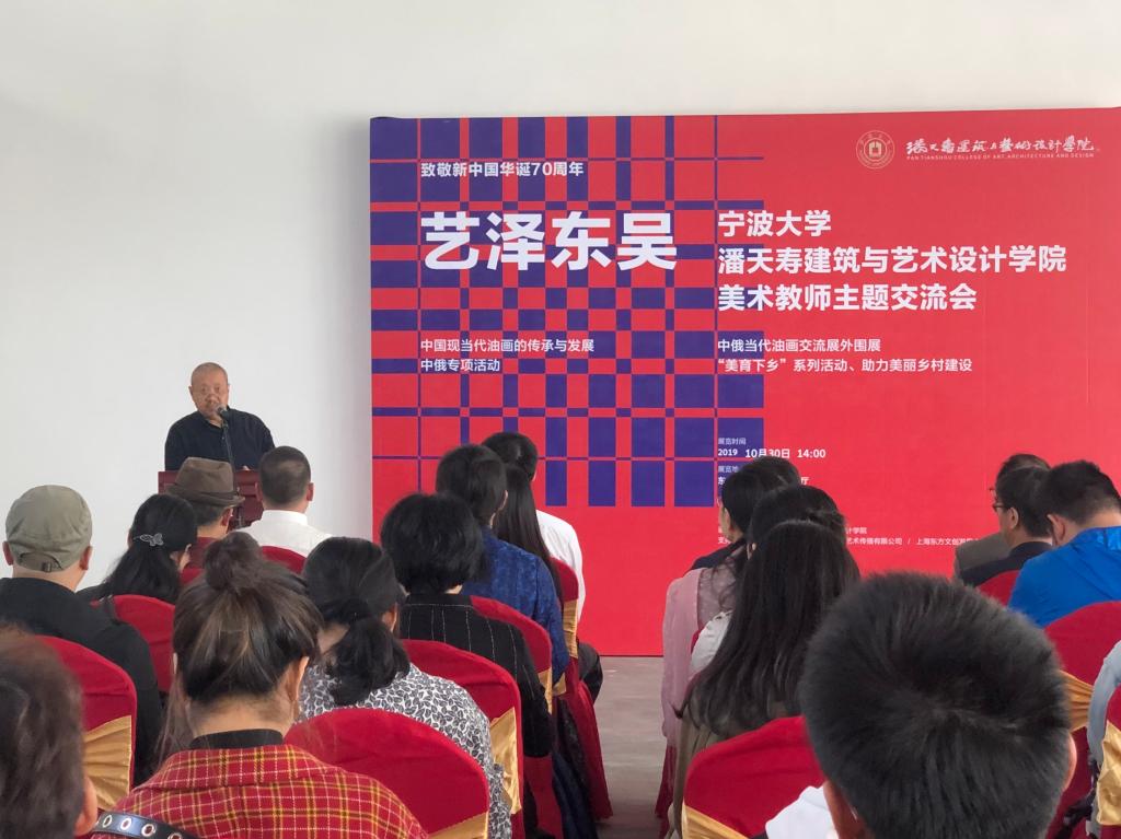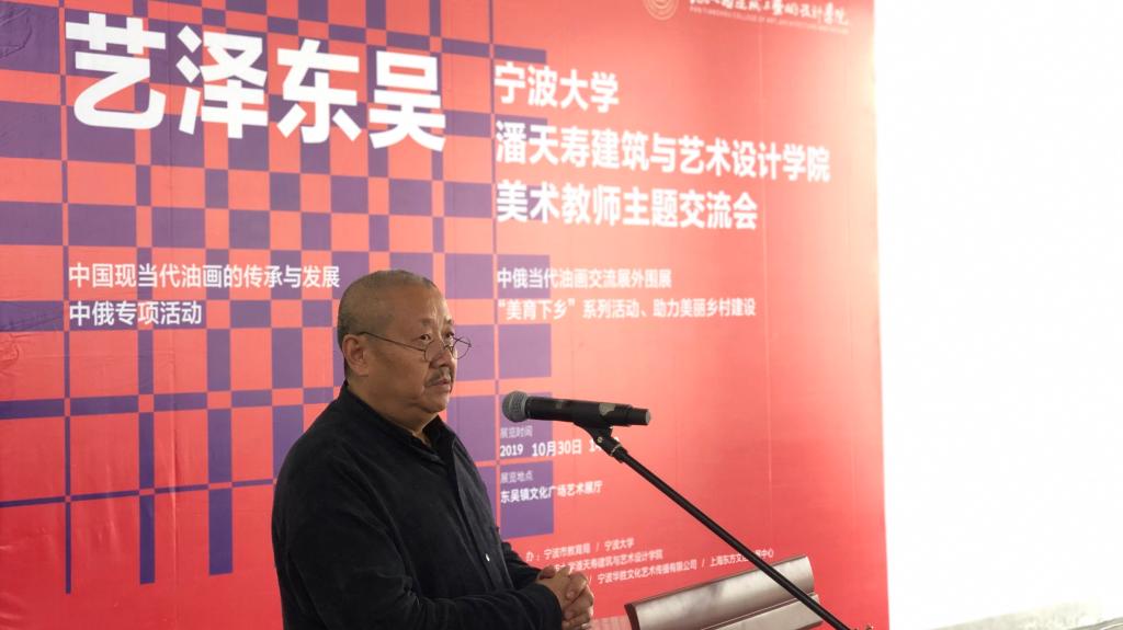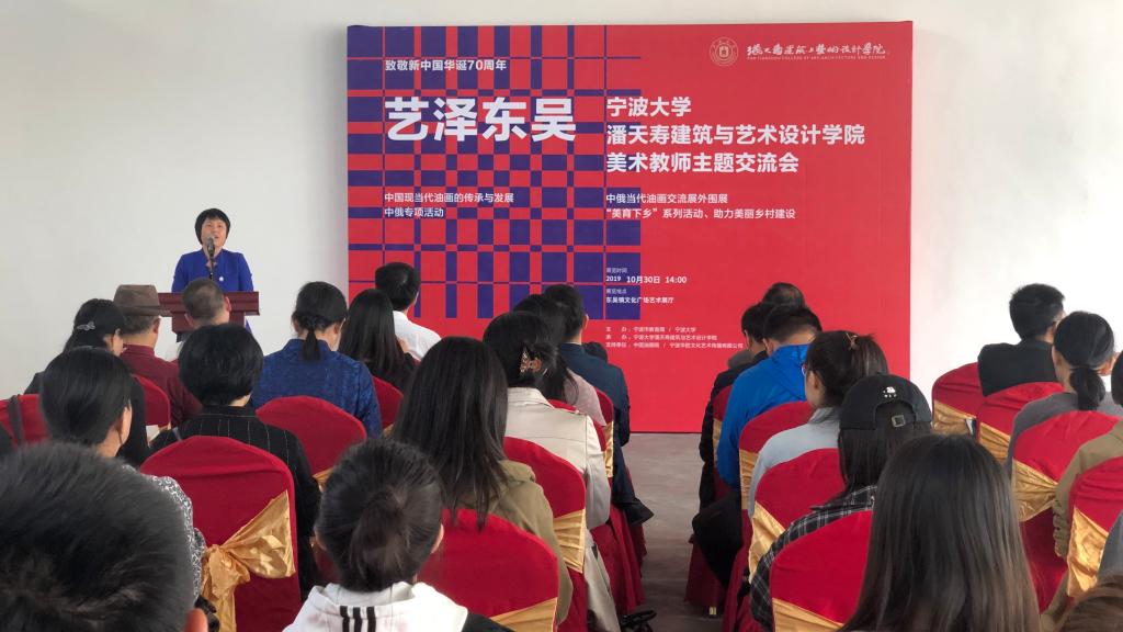 值此新中国成立七十周年为背景,依托宁波市教育局联合宁波大学主办的“中国现当代油画的传承与发展”国际研讨会和“继往开来”中俄当代油画交流展,宁波大学潘艺学院联合东吴镇政府,在双方展开全面合作之际,举办宁大潘艺学院创新创业基地落户东吴后的首个作品展和座谈交流会,作为中俄当代油画交流展外围展的同时,也是学院党委“美育下乡”的首个作品展。活动旨在用艺术为“美丽乡村”建设添砖加瓦, 另一方面也让我们的学生在此施展才华的同时能更深认识社会、人民,让他们的成长更有根基。