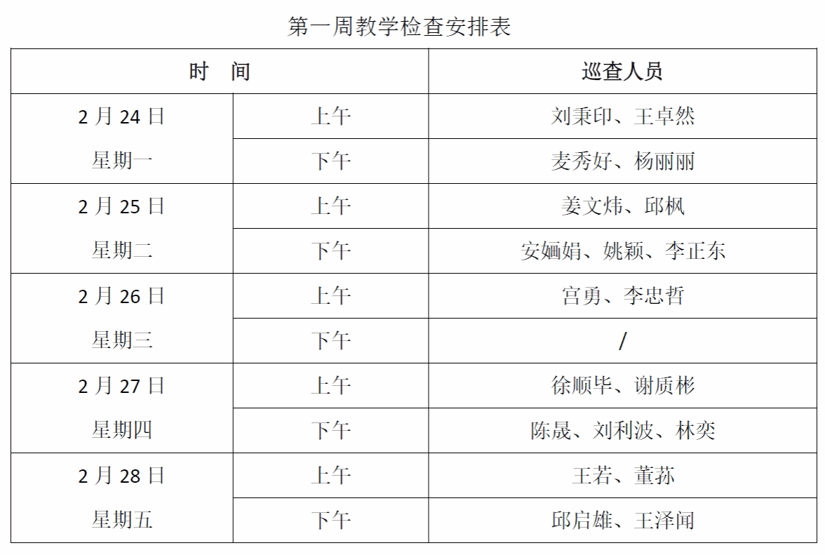 注:检查人员如遇特殊情况中,请提前做好调换,并通知教务办。