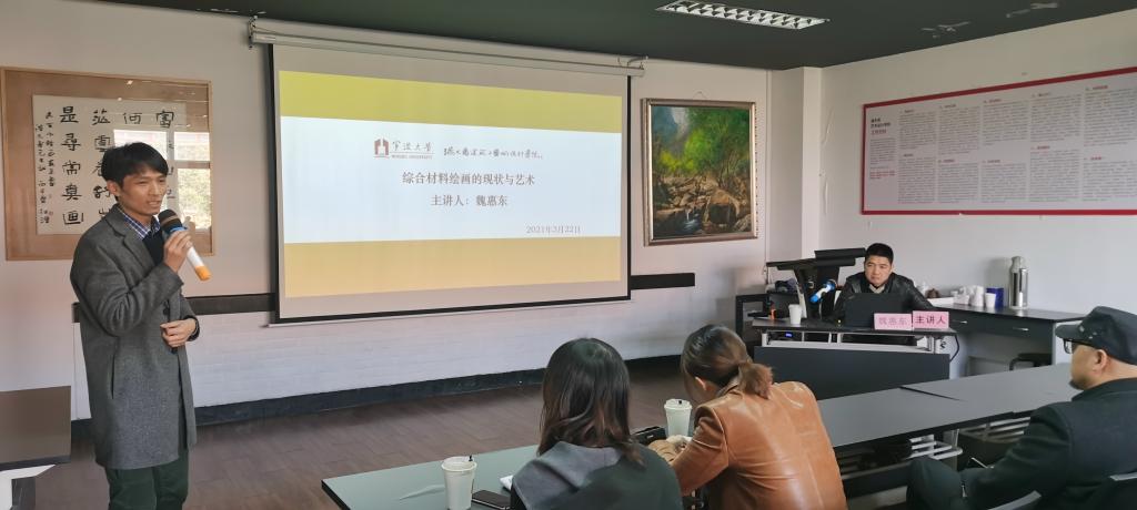 3月22日下午,宁波美术馆副馆长、一级美术师魏惠东应邀来我院进行学术交流,活动分为学术讲座和教学与创作指导两个主题。魏惠东不仅是当今我国综合材料绘画领域具有代表性的艺术家,而且在专业推广方面做了大量切实有效的工作,不断为推动宁波乃至全国综合材料绘画创作和研究发展而努力。魏惠东在讲座中分享了我国综合材料绘画的发展历程、国内外综合材料绘画不同时期具有代表性的艺术家作品,对宁波综合材料绘画创作和展览等相关内容经行了系统介绍,特别是在互动交流环节分享了他多年来系列作品的创作过程,为在场的师生提供了直接的艺术家案例。讲座活动结束后,部分师生陪同魏惠东一行到综合材料绘画教室,了解教学和课程并提出建议。