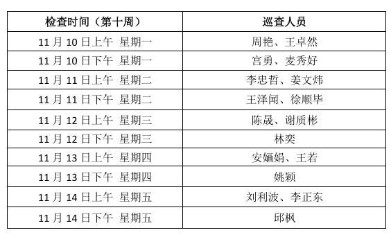 1、检查教师课堂教学基本规范执行情况(包括到课率,迟到、早退情况,上课地点与课表是否相符,课堂纪律情况等),如发现问题,请及时报告给教务办。检查时间:第十周(11月10日至11月14日)。巡查人员安排表如下: